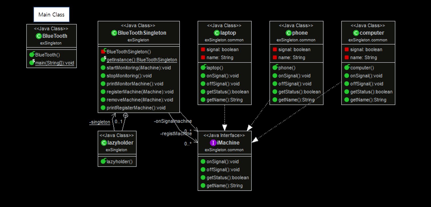 A - iMachine인터페이스와 laptop, phone, computer객체를 두어 블루투스 신호를 가진 기기를 구현한다.